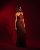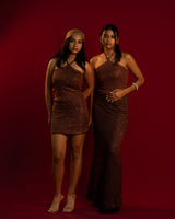 Inspired by sun soaked sands and golden hour glow, this three piece set is made to turn heads. Featuring a shimmering halter neck top paired with your choice of a mini or a maxi skirt, each piece is designed to hug the body and catch the light. Wear it your way, bold and short or flowing and dramatic for a look that owns the moment.